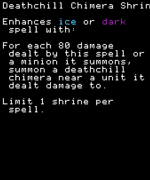 この呪文またはその召喚したミニオンが与えた80ダメージ毎に、そのダメージを与えたユニットの近くにデスチル・キマイラを召喚する。 RARE